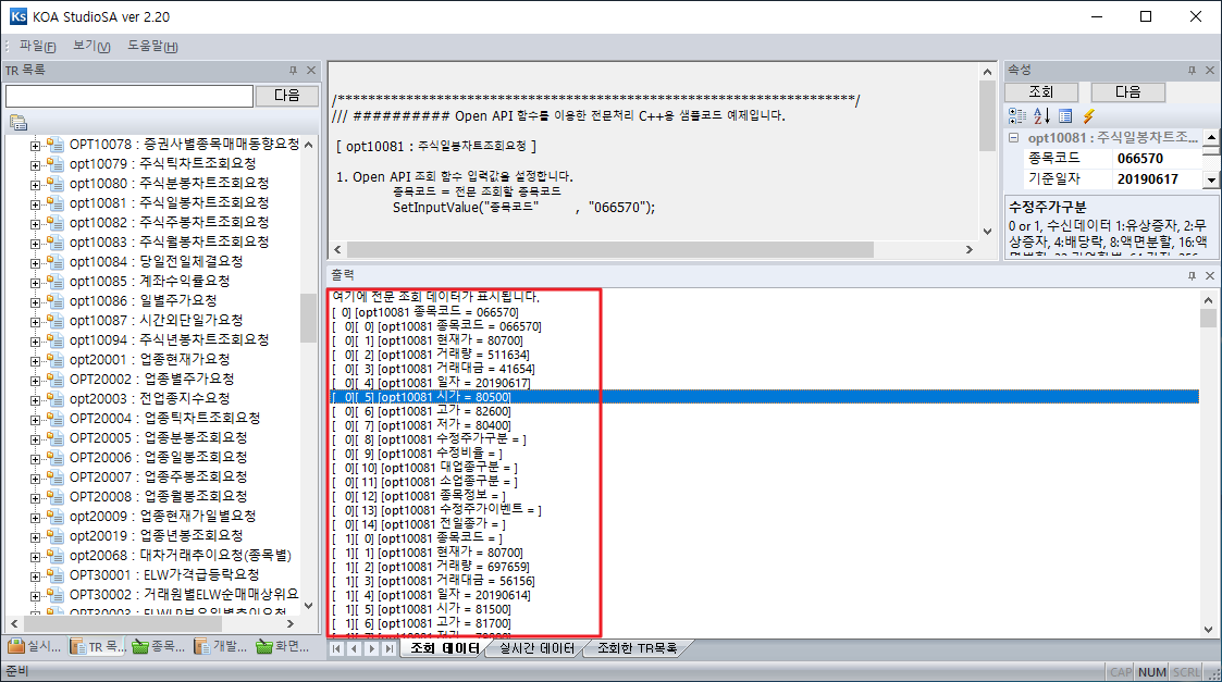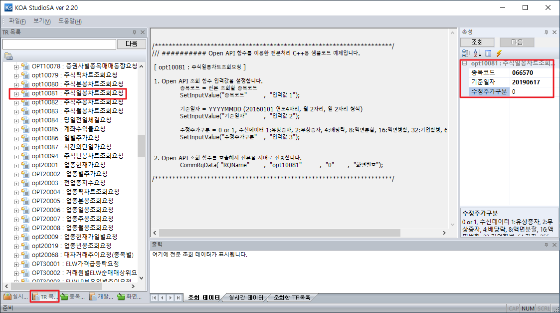 왼쪽 하단에 TR(transaction)목록을 클릭하고, 주식 분봉 데이터를 조회해보기 위해 좌측에서 opt10081: 주식일봉차트조회요청을 클릭한다. 마지막으로 어떤 종목의 일봉데이터를 조회할 것인지 종목정보를 우측 빨강색 네모칸과 같이 입력해보자 (LG전자를 조회해본다)