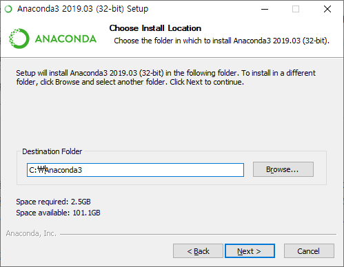 Anaconda 설치 진행중입니다. 설치 경로는 C:\ 바로 아래 폴더로 지정해줬습니다. 별다른 이유는 없고, depth 가 깊어지는걸 별로 안좋아해서 그렇습니다.