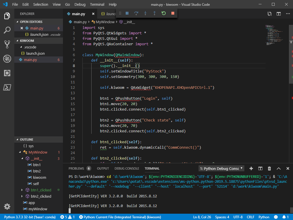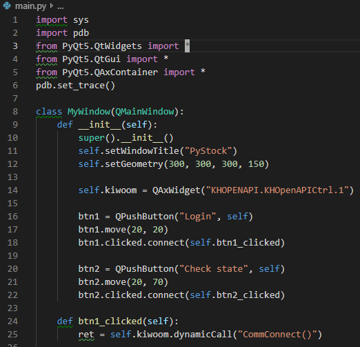- 키움 Open API를 이용하여 Log in 기능 구현 (PyQt5 으로 구현, VS code Warning 해결을 위한 트러블 슈팅)
