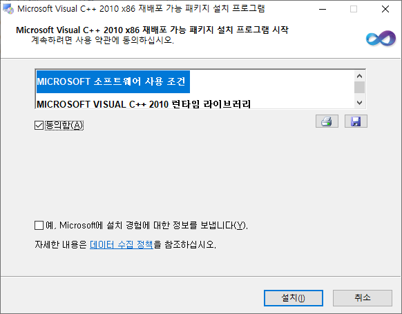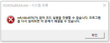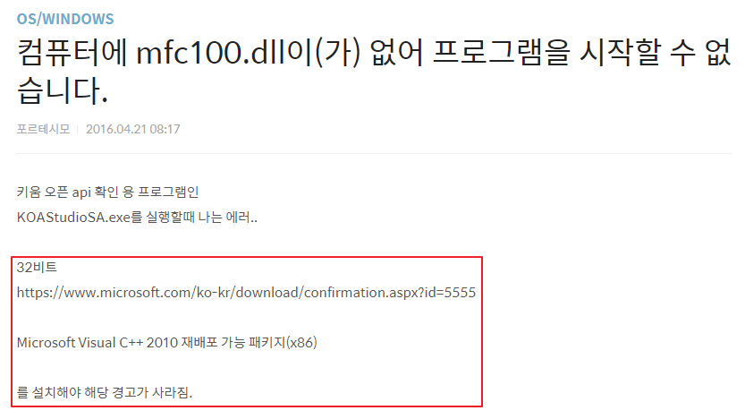 아래처럼 https://www.microsoft.com/ko-kr/download/confirmation.aspx?id=5555 에서 Microsoft Visual C++ 2010 재배포 가능 패키지(x86) 을 설치해야 한다고 한다. 바로 설치 ㄱㄱ (파일: vcredist_x86.exe)