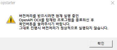 첫 로그인이라 그런지, 뭔가 굉장히 많이 다운로드 한다. 한번 다운로드하고나면, 이후에는 업데이트만 하기 때문에 로그인하는데 시간이 오래 소요되지 않을 것이다. 설치중간에 아래와 같이 팝업이 뜨는데, (중요) 바로 확인을 누르지 말고, KOA Studio 프로그램을 먼저 종료하고, 확인 버튼을 누르자