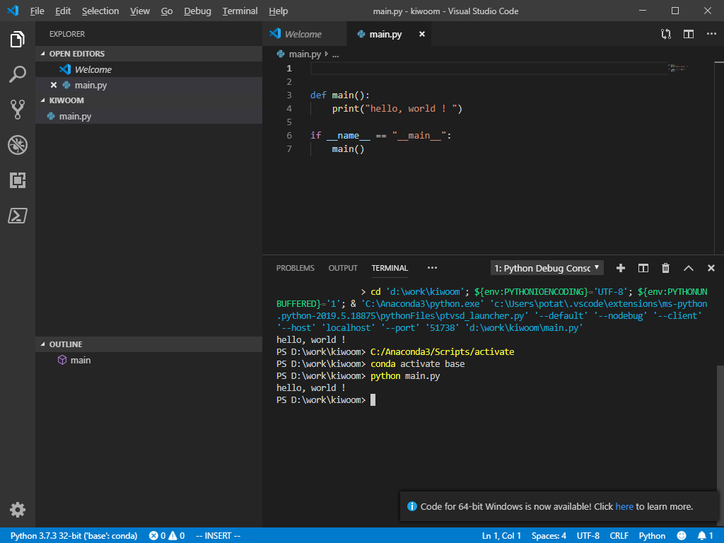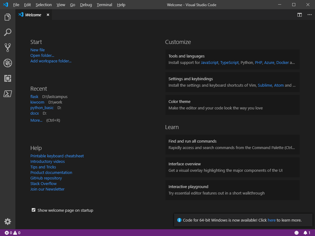 아래와 같이 정상적으로 VS Code가 실행이 되었다. 굿!