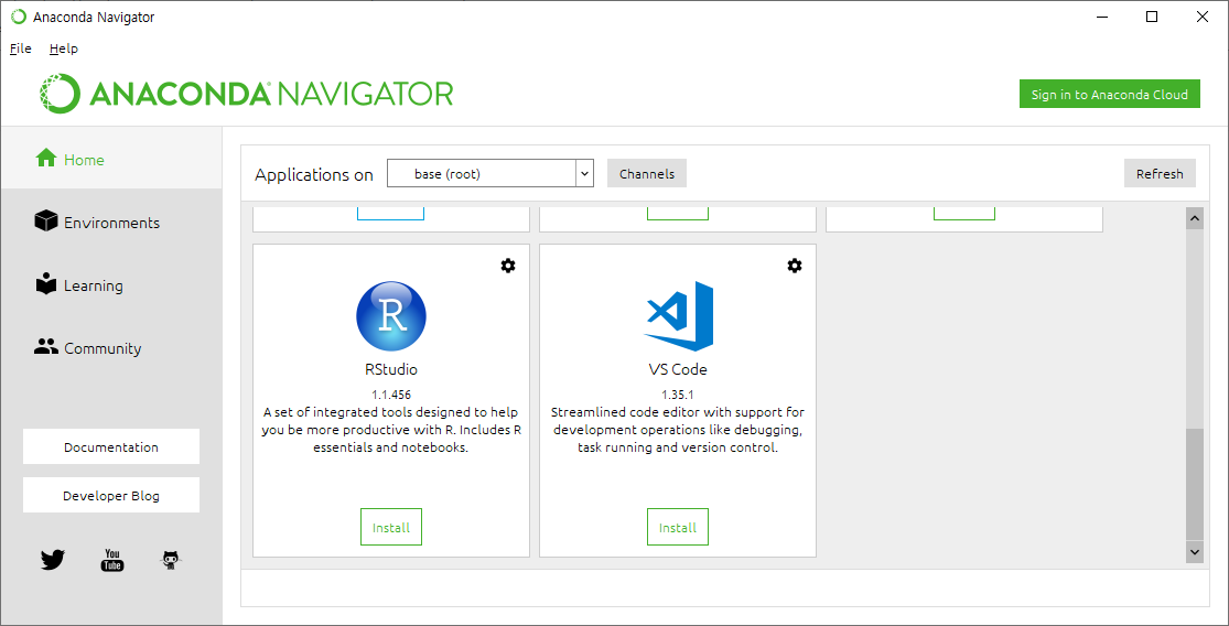 Anaconda Navigator 를 실행하고 나서, VS Code 를 찾아서 Install 버튼을 클릭해보자.