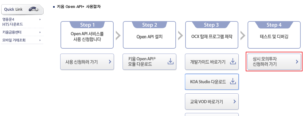 Open API 사용절차 그림에 나온대로 쭉 하면된다. Open API 서비스 사용신청은 이미 예전에 했으니, 키움 Open API+모듈 다운로드를 클릭해서 Open API 모듈을 노트북에 설치해보자.